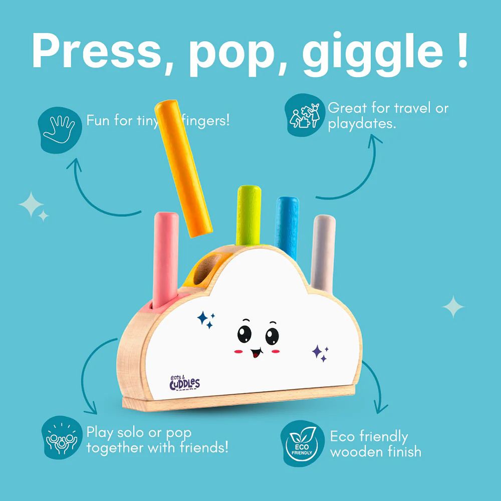 Cloudy Pop is a playful, interactive toy where kids push the stick inside the cloud to make a surprise pop out. Made from smooth, safe materials, it’s perfect for little hands while encouraging curiosity, hand-eye coordination, and fine motor skills. A fun and engaging toy that keeps children entertained while exploring cause-and-effect play